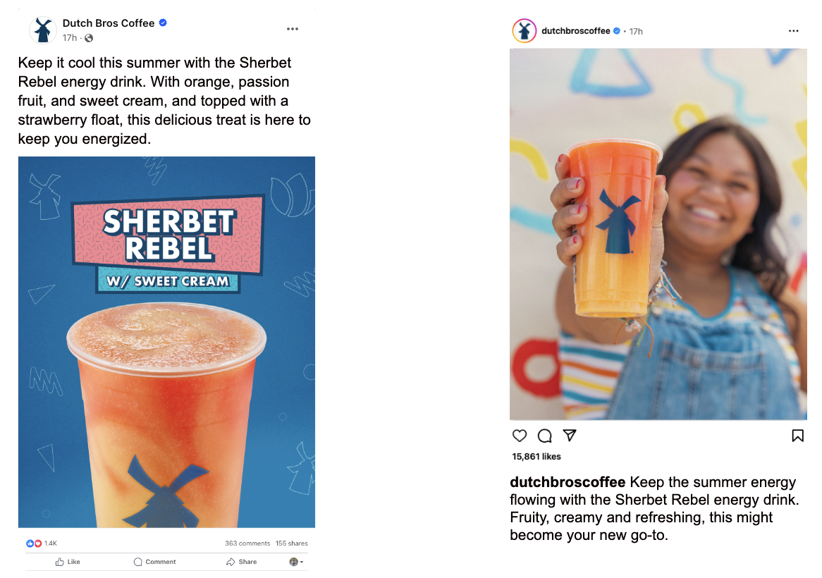 I write freelance social and CRM content for Dutch Bros, drive-thru coffee chain. Their voice is fun, casual, and appealing to their cult-like following and their social accounts reach over 1 million loyal customers.